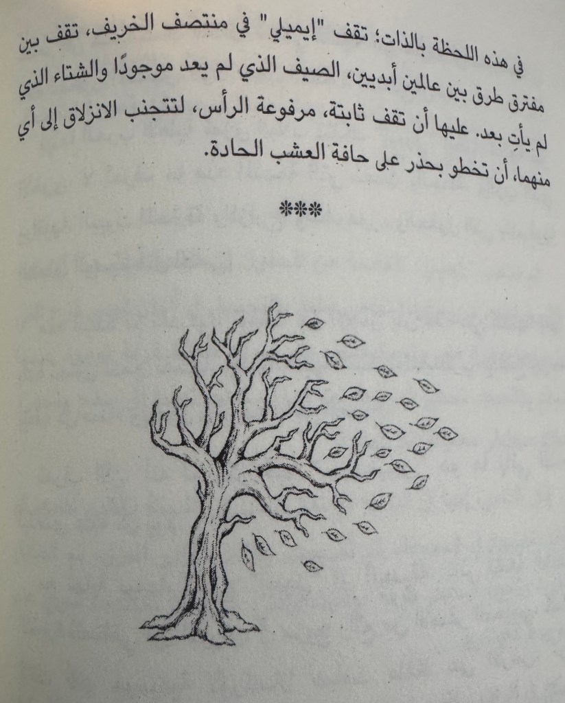 “لا تشعر إيميلي بالوحدة بقدر ما تشعر بها في الساعات التي تقضيها منحنيةً على الورق، وريشة الإوزة في يدها، والفأر الوهمي في الزاوية، وزيت مصباحها المأخوذ من حوت عملاق، والحبر.. الحبر الذي يأتي من بطن مخلوق رائع يعيش تحت الماء له ثمانية أذرع. قبل كتابة أي شيء، فإن الحبر نفسه يثير الدهشة بالفعل.”
